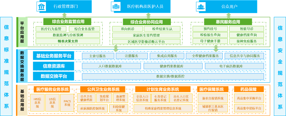 全民健康信息平臺以國家“4631-2”框架為依據(jù),根據(jù)國家衛(wèi)計委《“十三五”全國人口健康信息化發(fā)展規(guī)劃》的要求,進行全員人口數(shù)據(jù)庫、電子健康檔案數(shù)據(jù)庫、電子病歷數(shù)據(jù)庫的建設,支撐六大類業(yè)務應用(公共衛(wèi)生、計劃生育、醫(yī)療服務、醫(yī)療保障、藥品供應和綜合管理),實現(xiàn)惠民、監(jiān)管及協(xié)同服務;實現(xiàn)與國家平臺互聯(lián)互通。